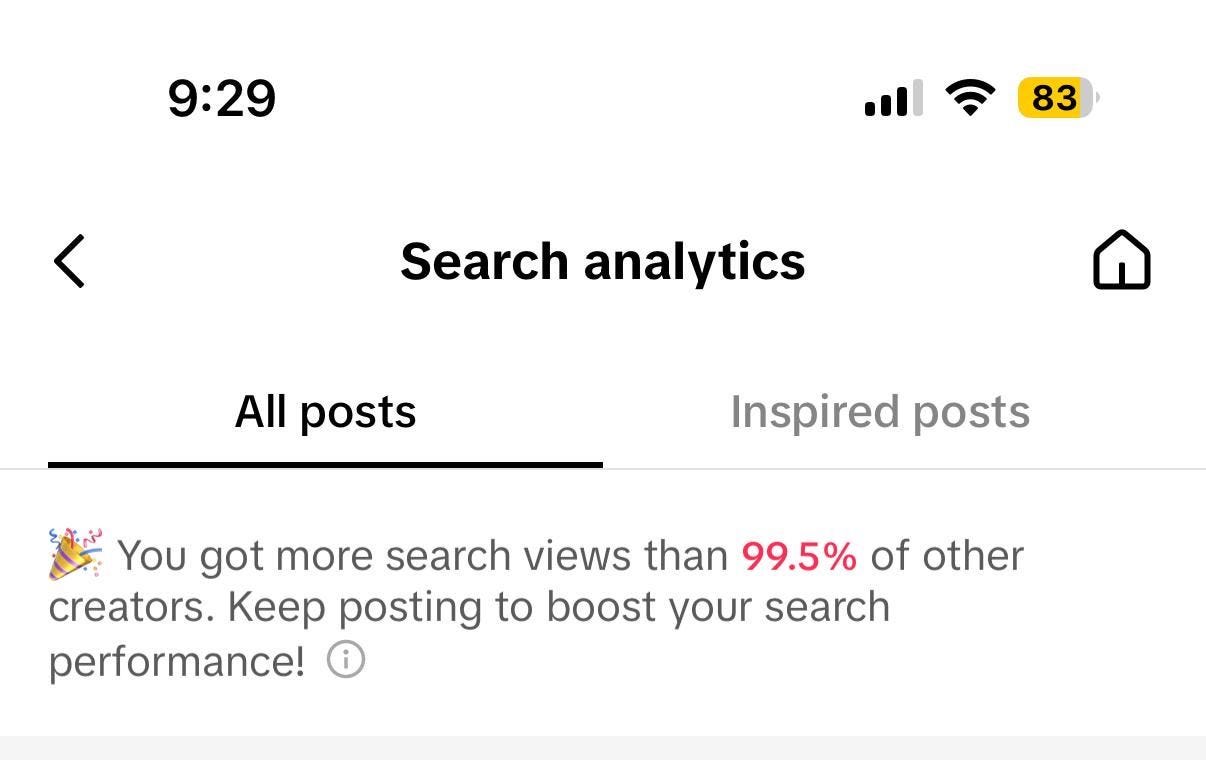 EXAMPLE: Screenshot of our client who 90% of their leads come through TikTok. We’ve done this through optimising each post to be SUPER clear on what they are speaking about and what someone would search, so that they’re in the top 99.5% of search views and clients say “I searched on TikTok and you were the first to come up”